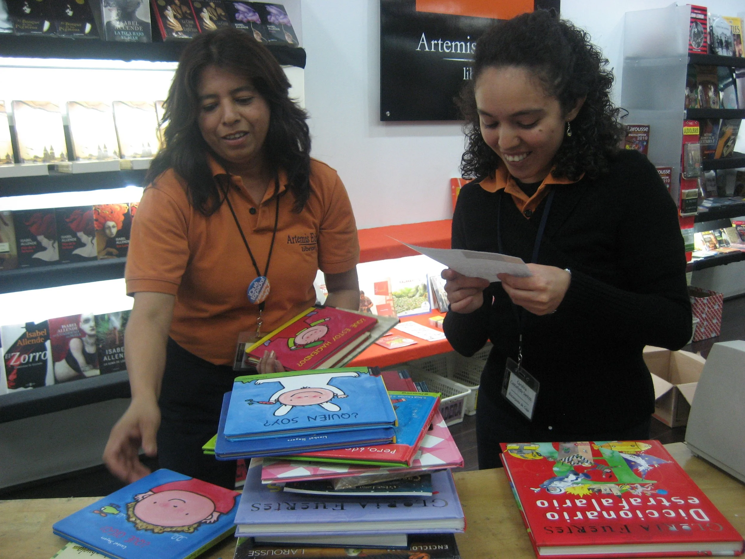Meets community leaders in the capital city to acquire all resources. In Guatemala City, a teacher and her son shop for the books and materials requested by the faculty at Jun Toj elementary school in Rabinal.